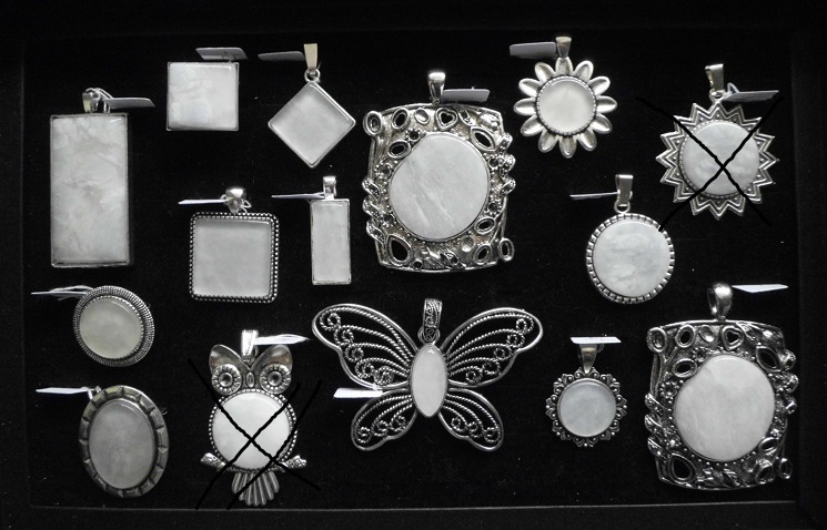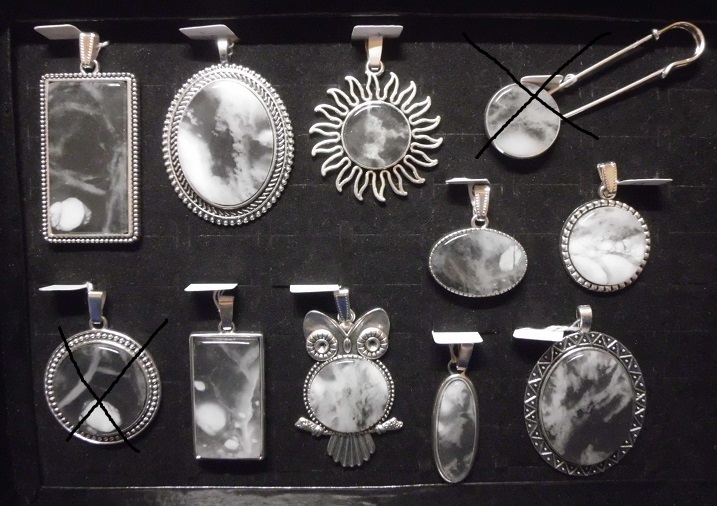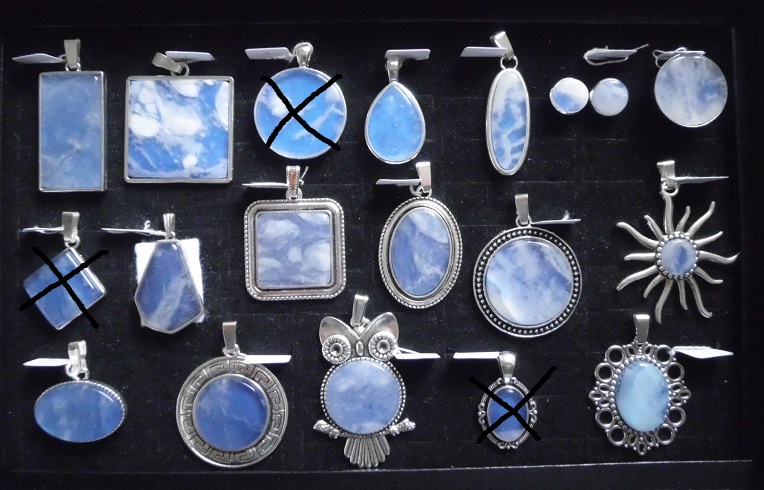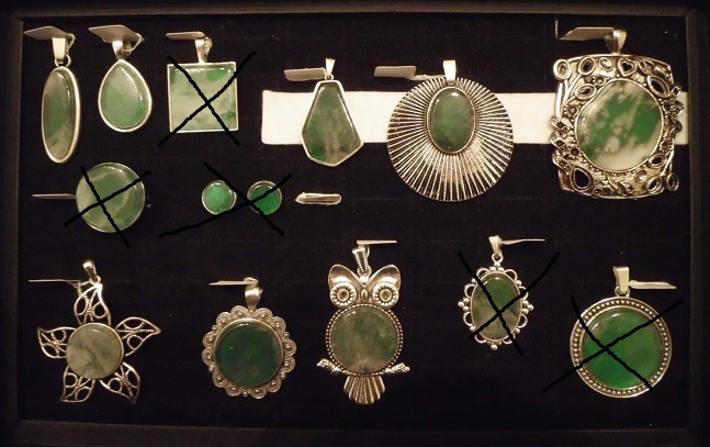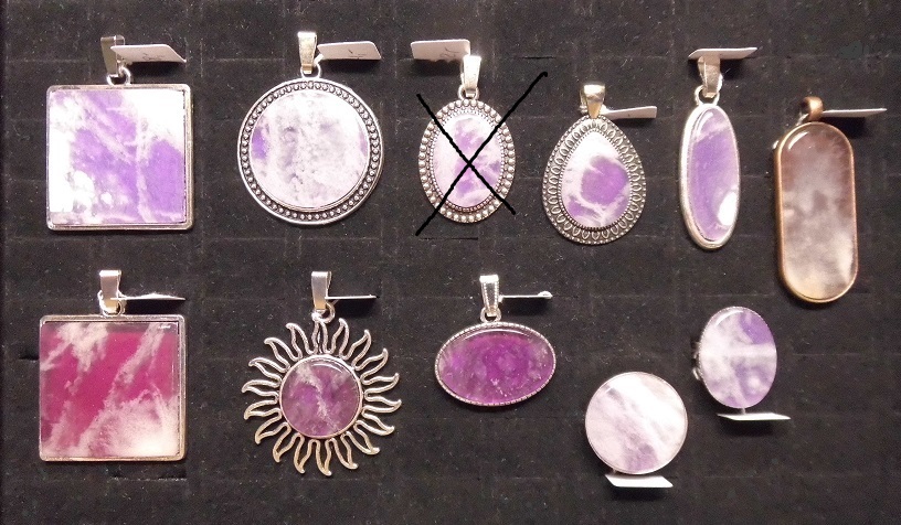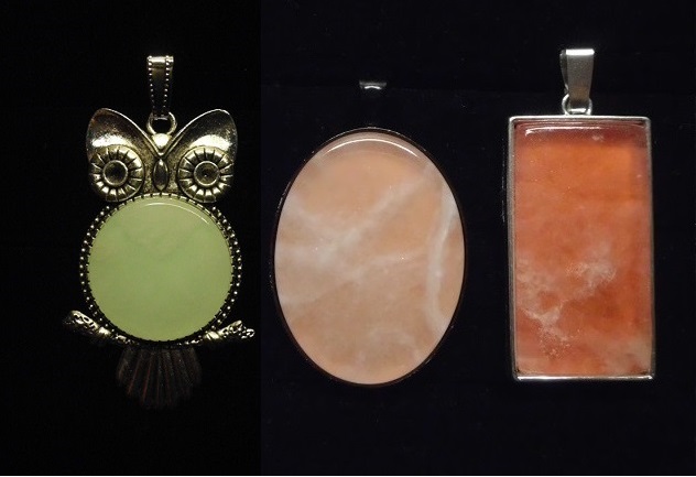 Die von mir von Hand gefertigten und genau in die Fassungen eingepassten Alabaster-Schmucksteine werden direkt nach dem Schleifen , wodurch der Alabaster wunderbar durchscheinend und die innere Steinstruktur sichtbar wird, mit einer speziellen Farbe versehen und nach dem Trocknen mit nicht gilbendem Schutzlack überzogen.